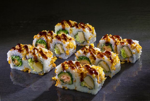 und jeweils 4 Scheiben frischer Thunfisch und Lachs (E)